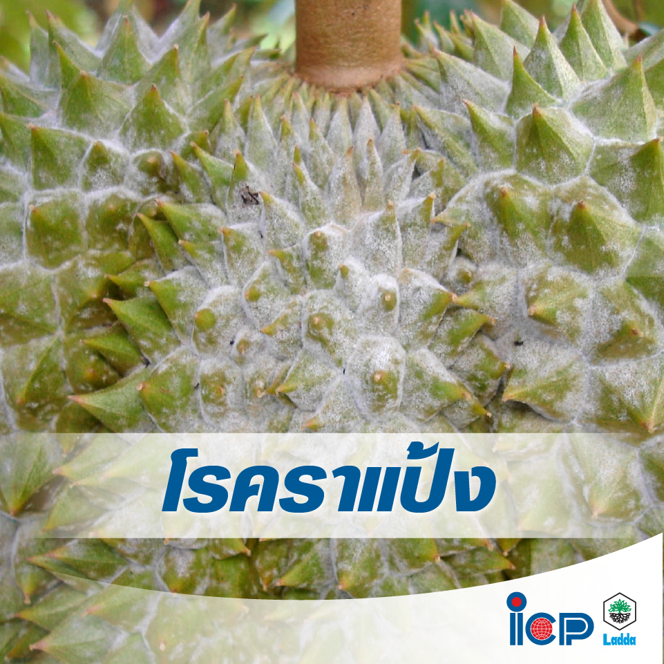 เชื้อราที่เป็นตัวการคือ Oidium sp. โดยสามารถเข้าทำลายทุเรียนได้ตั้งแต่ช่วงดอกบานจนถึงช่วงเริ่มติดผล อาการที่พบคือ บริเวณดอกหรือผลจะมีผงเชื้อราสีขาวๆคล้ายแป้ง ทำให้ไปรบกวนการเจริญเติบโตของทุเรียน ผลออกมาไม่สวย รสชาติไม่ดี ไม่สามารถนำไปขายได้
