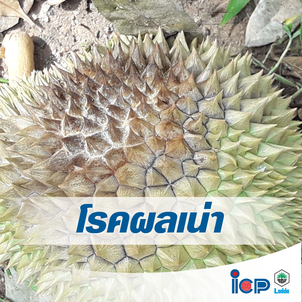สาเหตุคือเชื้อราชื่อ Phytophthora palmivora ซึ่งเป็นเชื้อตัวเดียวกับโรครากเน่าและโคนเน่า สามารถเข้าทำลายผลทุเรียนได้ทั้งช่วงอ่อนและช่วงแก่ อาการของโรคที่สังเกตได้คือ ผลทุเรียนจะมีรอยราขาวๆ ดูคล้ายผงแป้ง มีรอยช้ำเป็นจ้ำๆ เน่าไปถึงเนื้อได้ ทำให้ผลทุเรียนขายไม่ได้ราคา