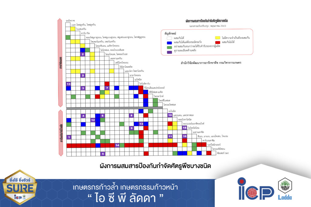 – ในการผสมสารป้องกันกำจัดโรคพืชแบบเฉพาะจุดร่วมกับสารป้องกันกำจัดโรคพืชแบบหลายตำแหน่งต้องดูคุณสมบัติหลังการผสมว่าเข้ากันได้หรือไม่ โดยดูจากผังการผสมสารป้องกันกำจัดศัตรูพืช (ภาพที่ 2) หรือทำการทดสอบ jar test เพื่อดูความเข้ากันได้ของสารที่จะนำมาผสมกัน