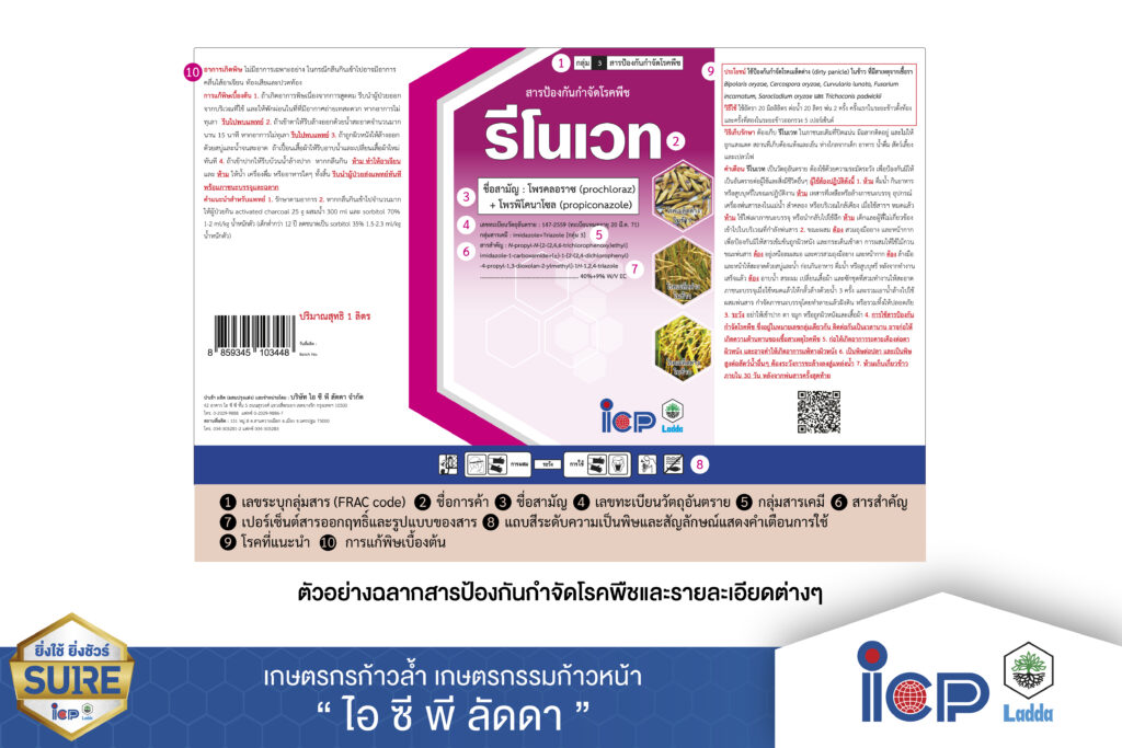 – การใช้สารป้องกันกำจัดโรคพืชรหัสกลุ่มต่างกัน (ตารางที่ 1) หมายถึงการใช้กลุ่มสารเคมีที่แตกต่างกัน ข้อควรสังเกต สารป้องกันกำจัดโรคพืชที่มีชื่อทางการค้าต่างกันอาจเป็นสารเคมีในกลุ่มเดียวกันได้ โดยให้สังเกตชื่อสามัญที่ฉลาก (ภาพที่ 1)